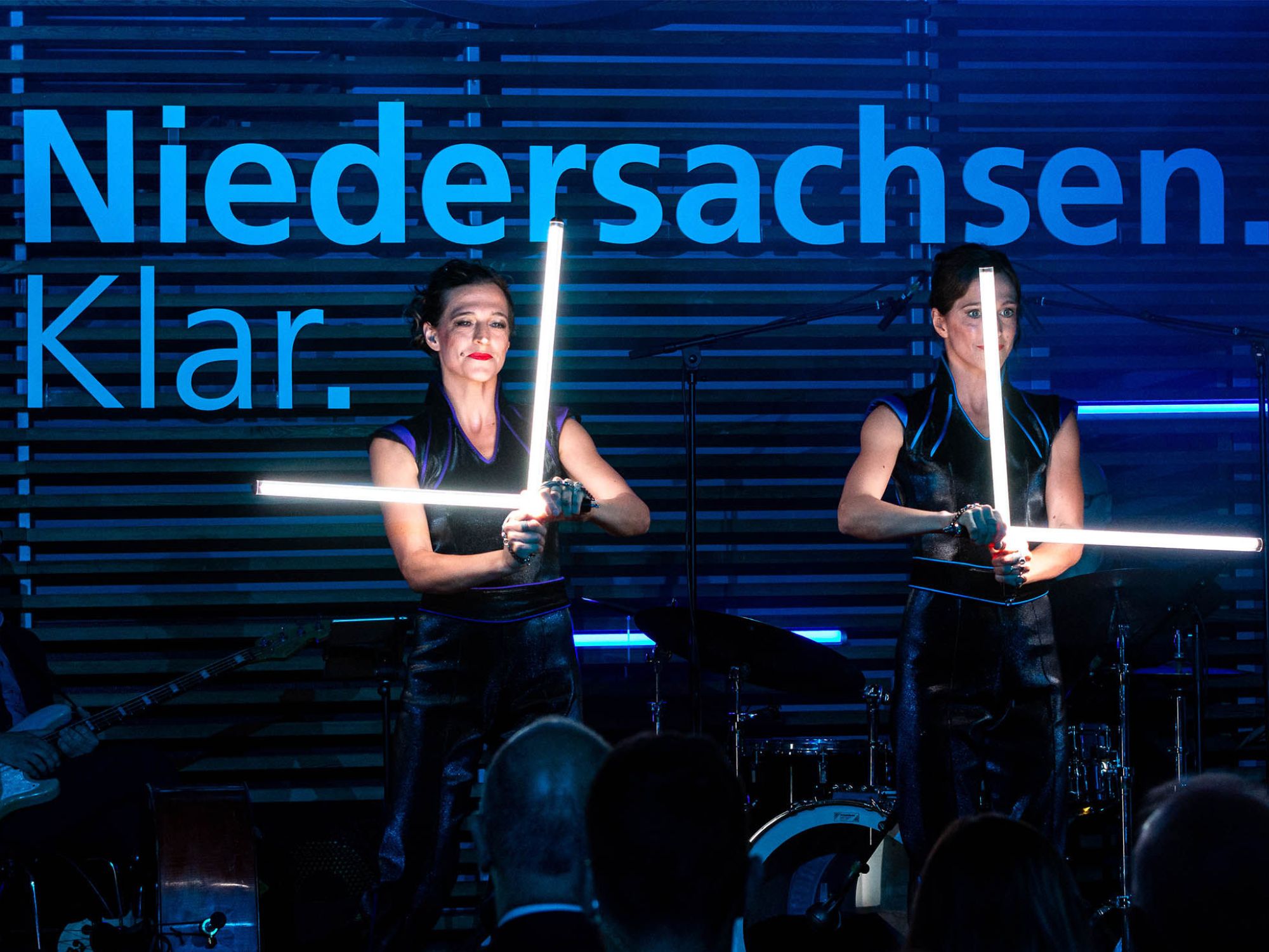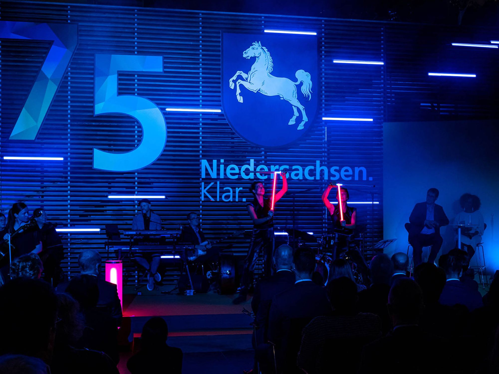 Das gut einstündige Galaprogramm wurde von niedersächsischen Künstler*innen gestaltet. Wir waren mit dabei und präsentierten eine LED-Show mit zwei Artistinnen. Zum Finale der Show inszenierten wir das Landeswappen, Niedersachsen-Schriftzüge und das 75-Jahre-Jubiläums-Logo mit programmierbaren LED-Requisiten.