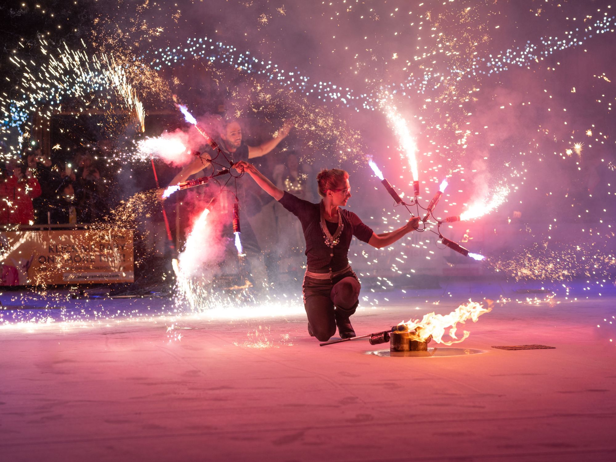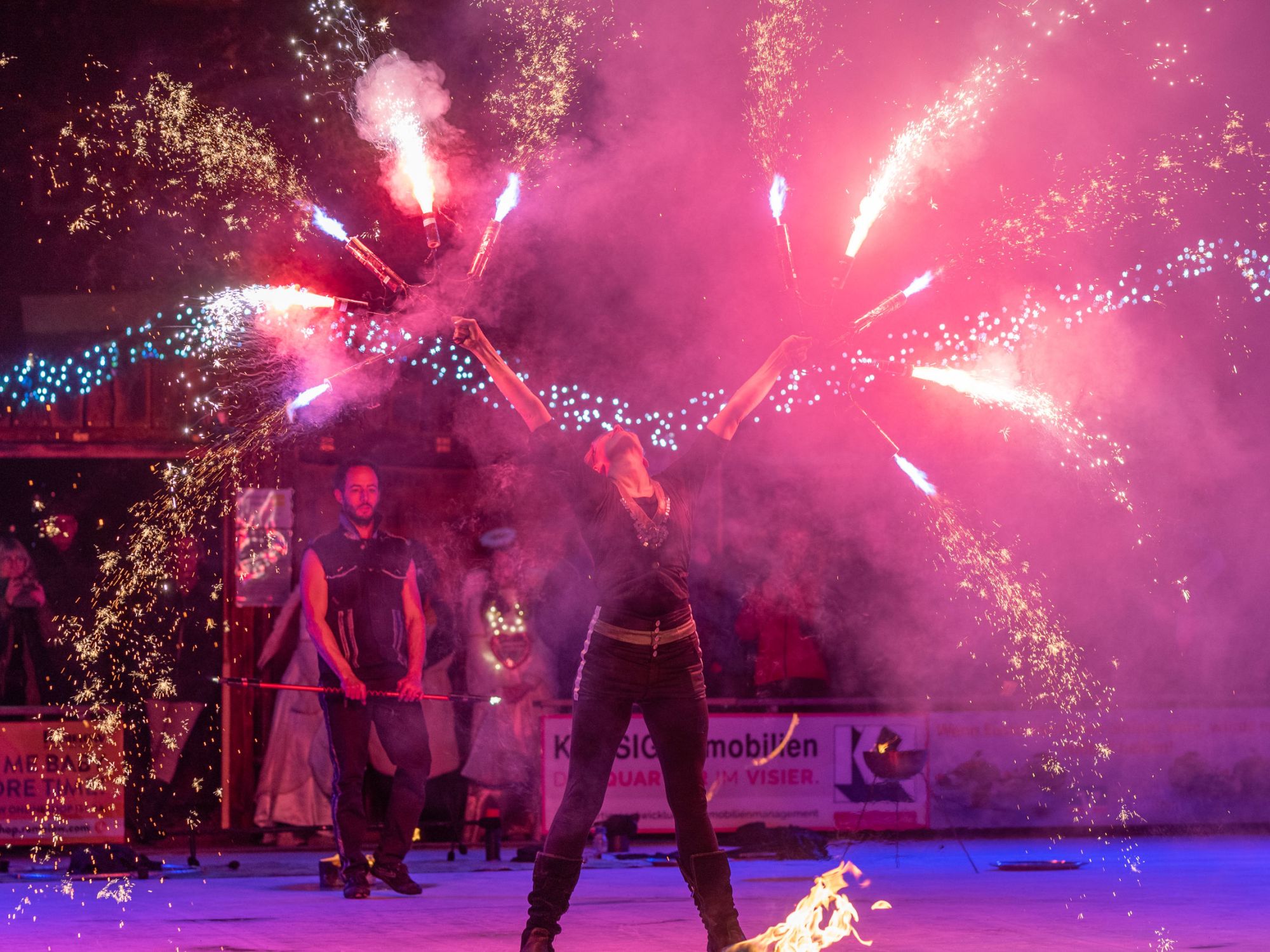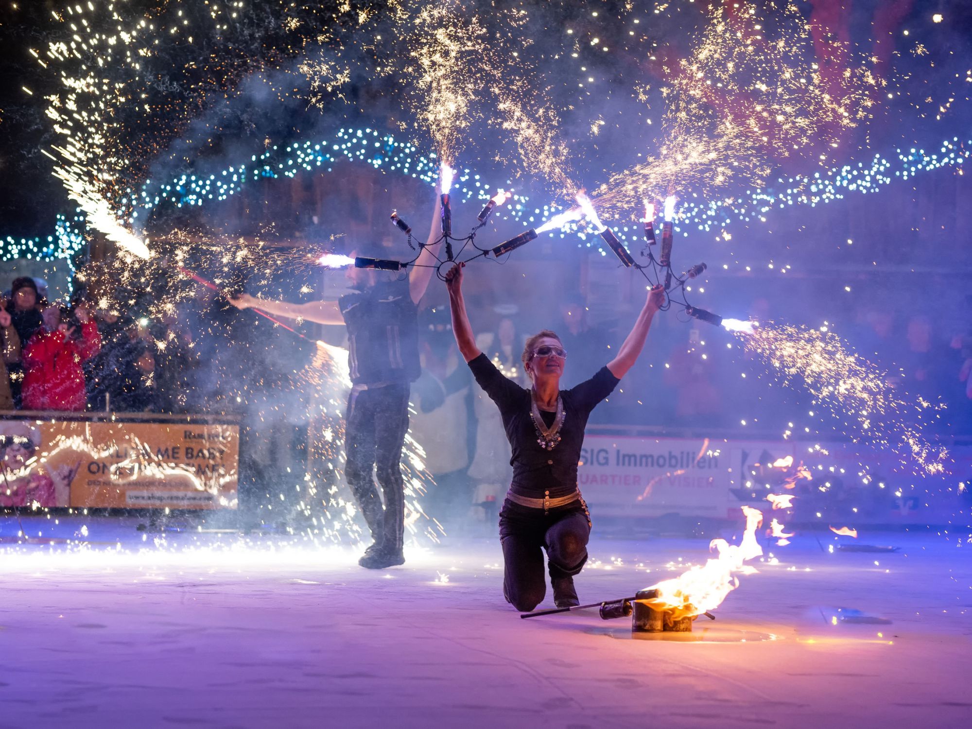 Die Flammendekoration auf der Auftrittsfläche und eine stimmungsvolle Illumination der Eisfläche sorgten für einen schönen Rahmen. Als Highlight zum Ende der Feuershow inszenierten wir ein beeindruckendes Funken-Finale. Dabei setzten wir Bühnen-Pyrotechnik ein, die von den Künstler*innen mit speziellen Requisiten artistisch inszeniert wurde.