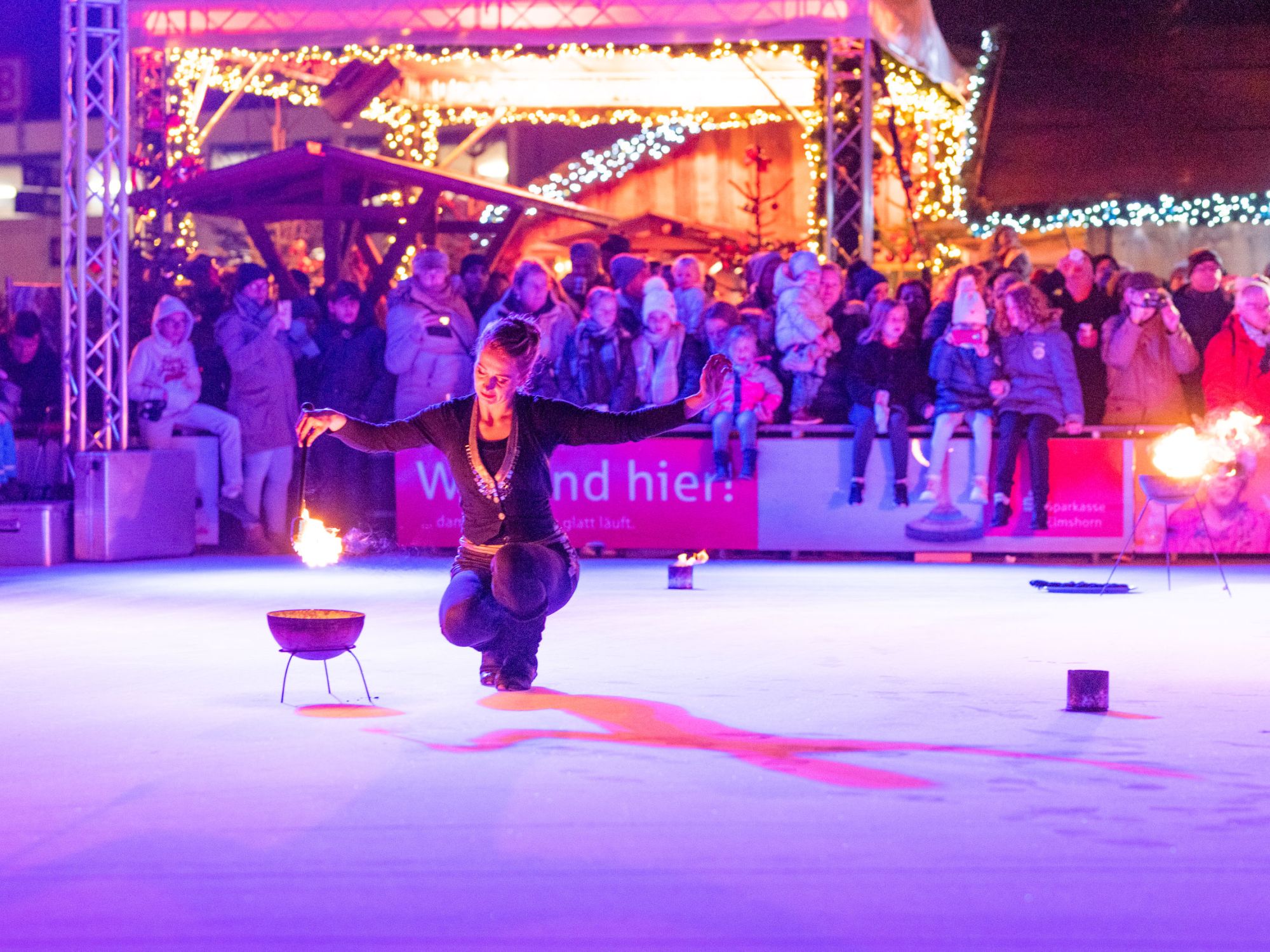 Zur Eröffnung des diesjährigen Eisvergnügens haben wir eine Funken-sprühende Feuershow auf der Eislaufbahn in Elmshorn aufgeführt.