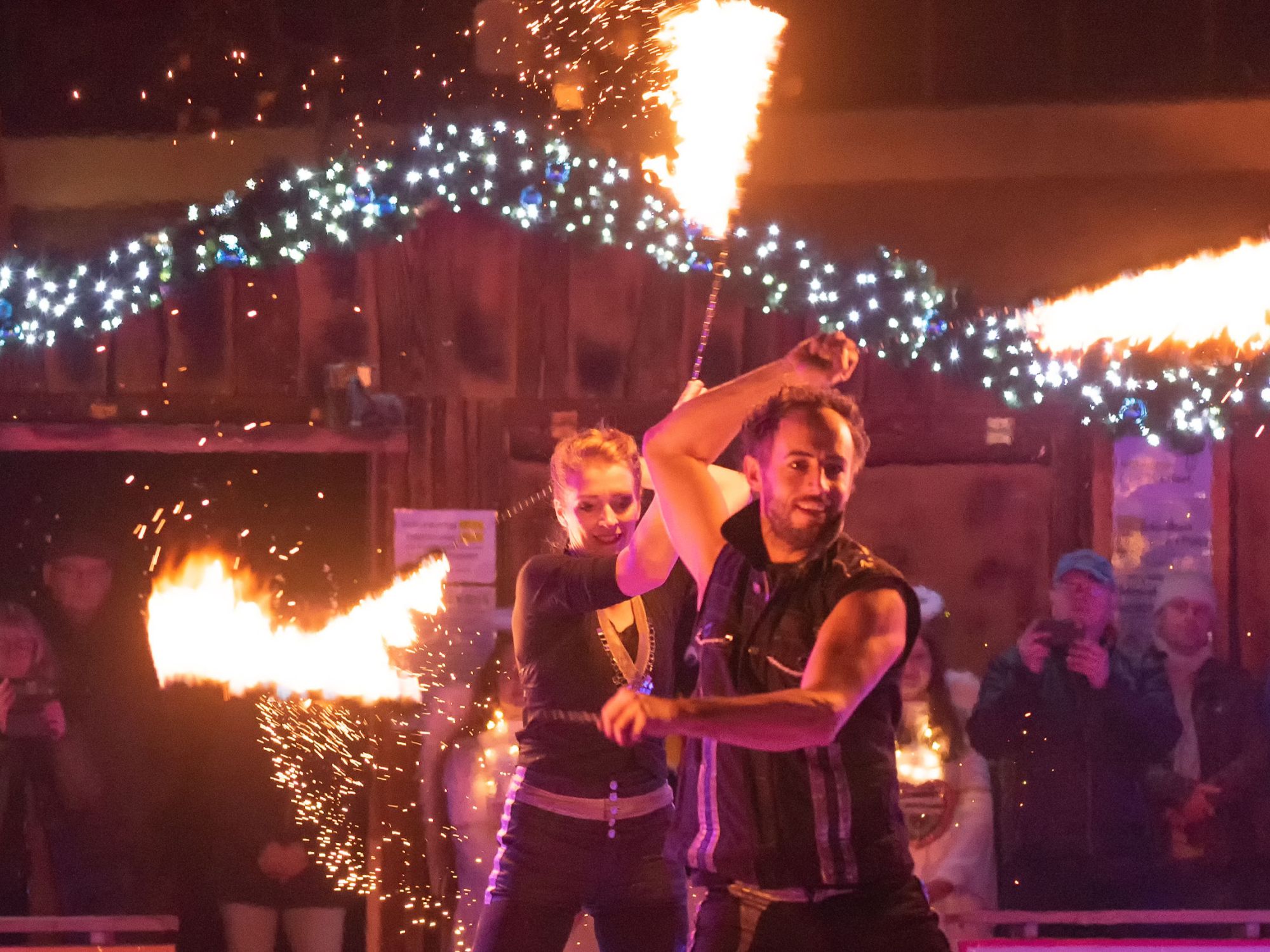 Zwei Feuerartist*innen präsentierten eine abwechslungsreiche Show, bei der sich spannende Momente mit überraschenden Flammenbildern abwechselten. Mit verschiedenen brennenden Requisiten führten die Künstler*innen eine Choreografie mit Feuertanz und akrobatischen Elementen auf.