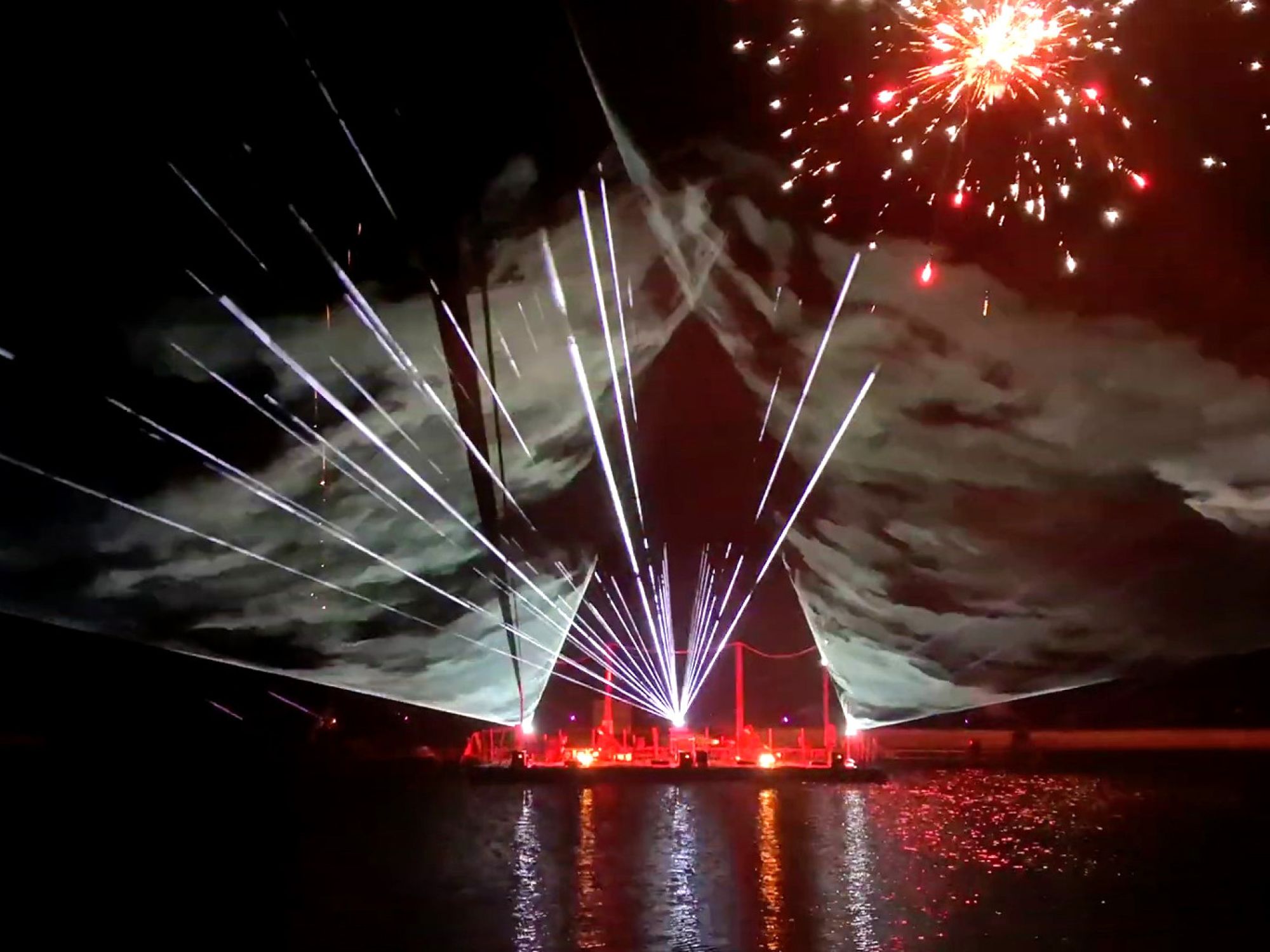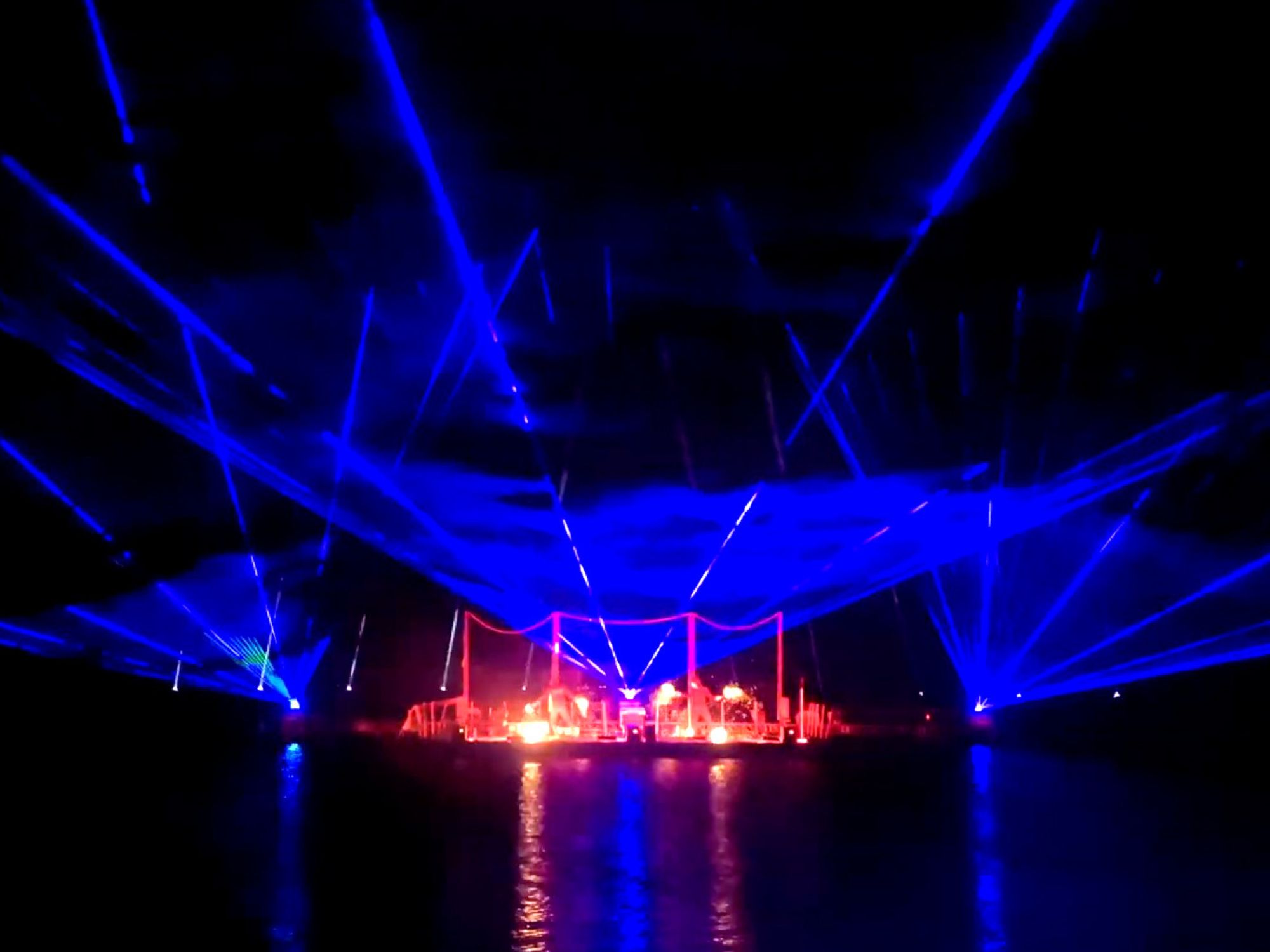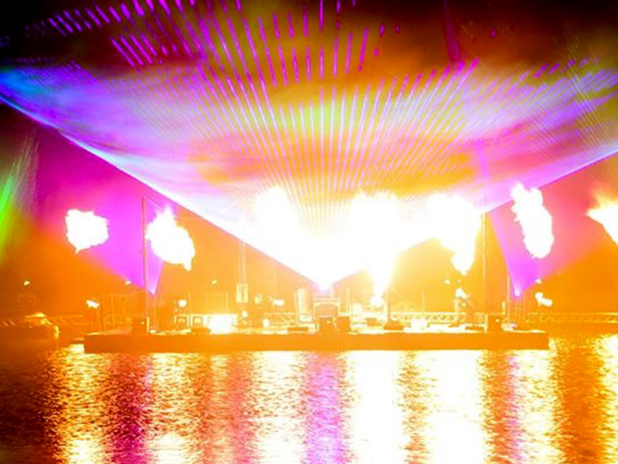 Etwa 2.500 Gäste konnten unsere Feuer- und Lasershow für Lagune in Flammen bewundern. Drei Feuerartist*innen präsentierten eine Feuershow auf der Wasserbühne und boten eine ganze Reihe unterschiedlicher Flammen- und Funkeneffekte. Dabei wurden sie begleitet von einer Musik-synchronen Lasershow. Zudem brachten Flammenprojektoren noch mehr Feuer auf die Bühne und im Finale der Show ergänzten wir ein Feuerwerk.