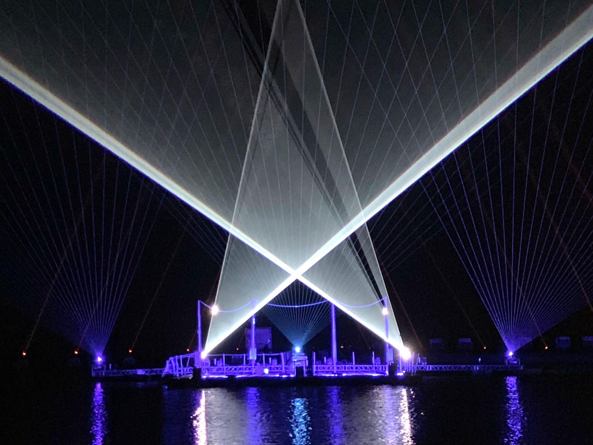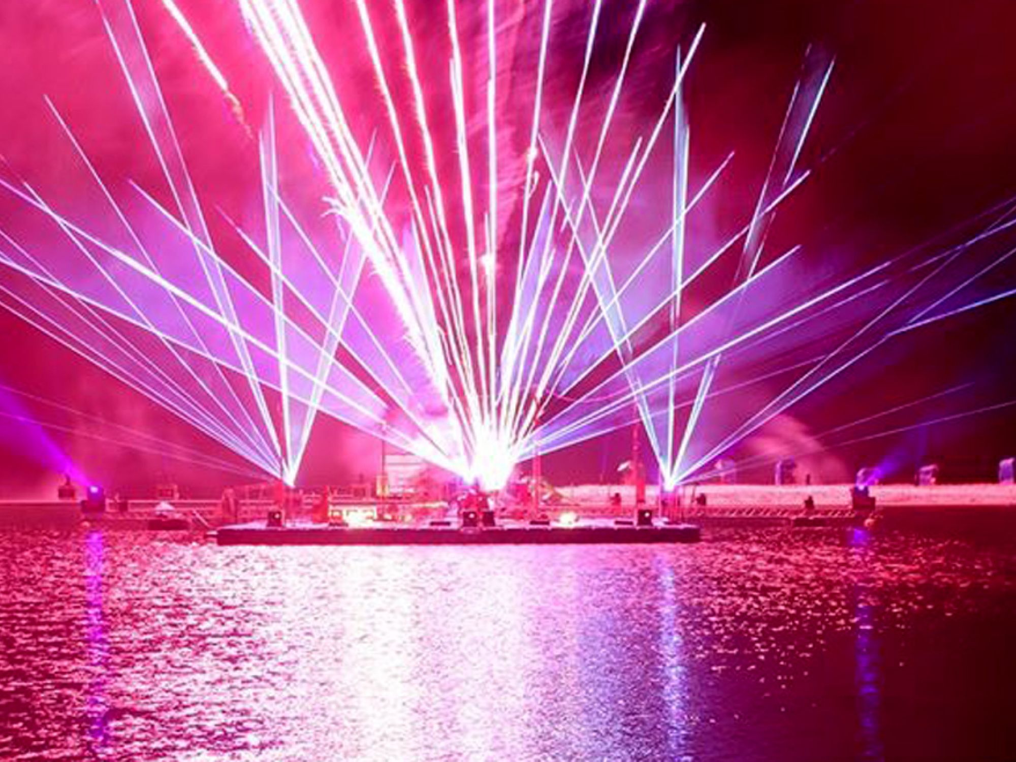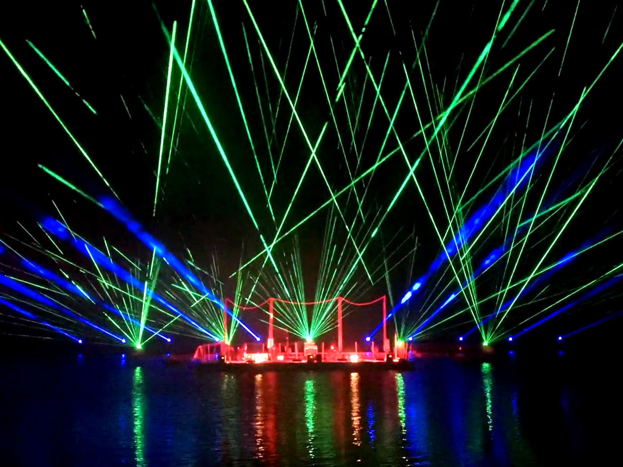 Etwa 2.500 Gäste konnten unsere Feuer- und Lasershow für Lagune in Flammen bewundern. Drei Feuerartist*innen präsentierten eine Feuershow auf der Wasserbühne und boten eine ganze Reihe unterschiedlicher Flammen- und Funkeneffekte. Dabei wurden sie begleitet von einer Musik-synchronen Lasershow. Zudem brachten Flammenprojektoren noch mehr Feuer auf die Bühne und im Finale der Show ergänzten wir ein Feuerwerk.