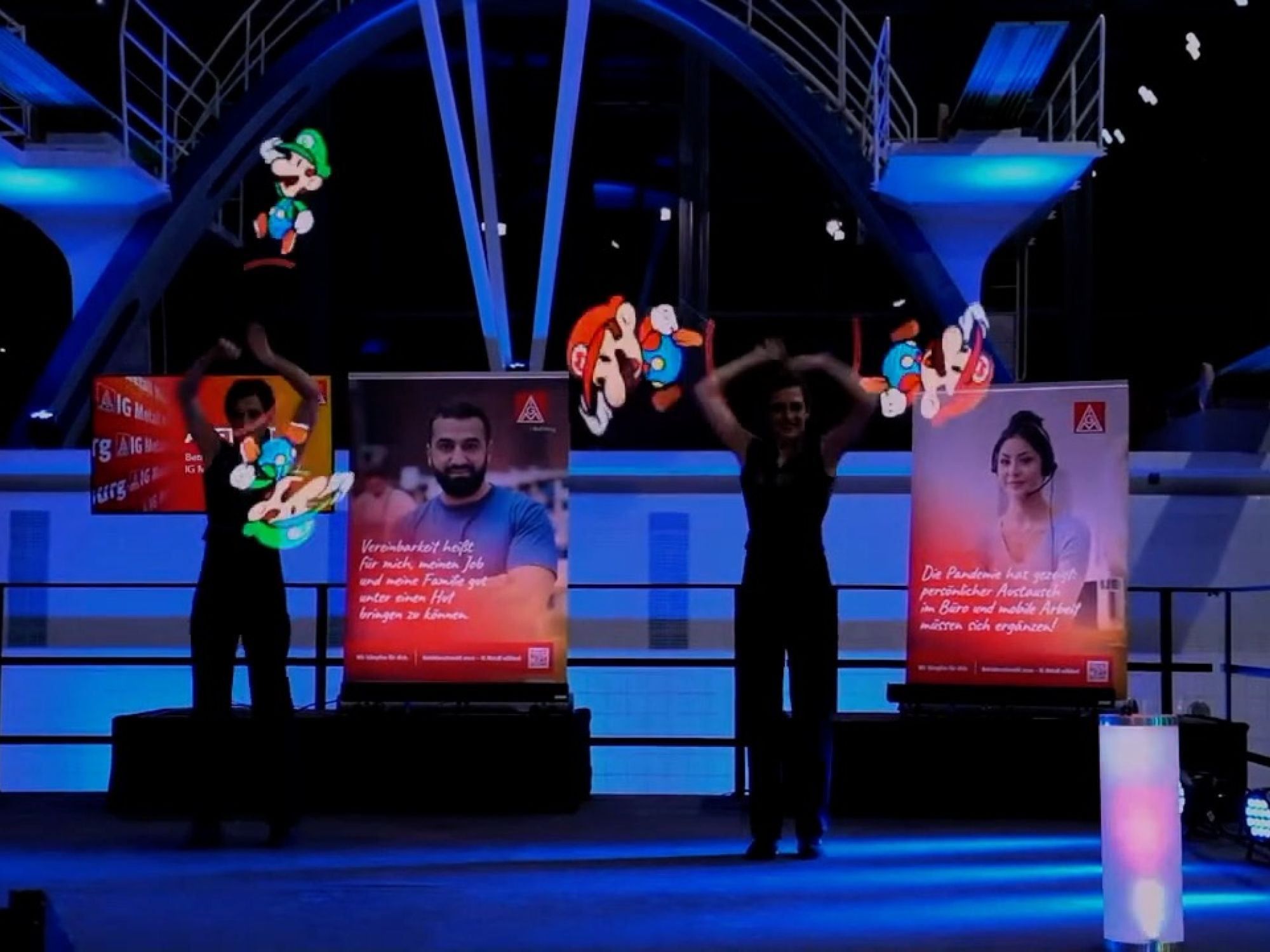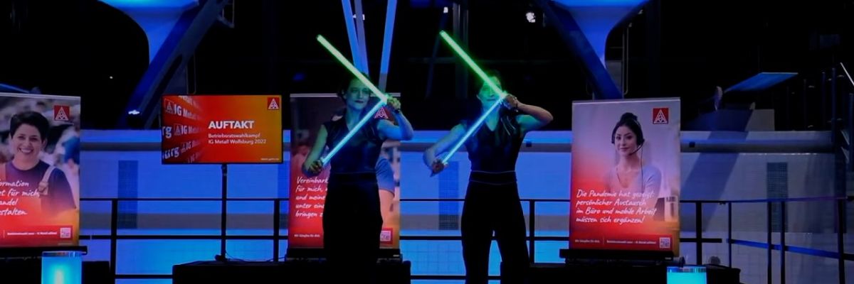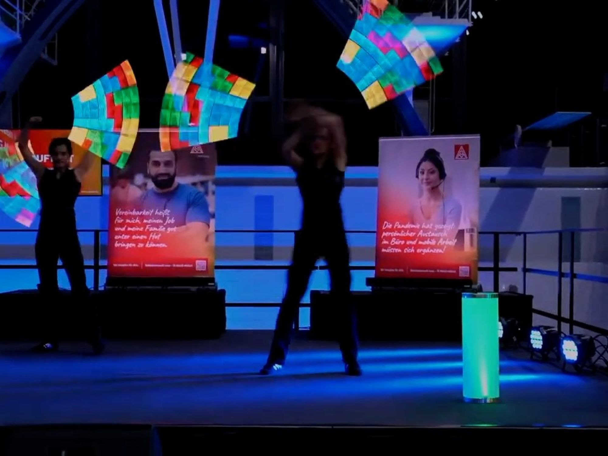 Dabei wurden Perspektiven für die kommenden Wochen und die Kampagne der IG Metall vorgestellt. Wir waren mit dabei und eröffneten die Veranstaltung mit einer LED-Lichtshow. In unserer Show inszenierten wir das Logo der IG Metall und die Kampagnen-Schriftzüge. Darüber hinaus stellten wir einen artistischen Bezug zur Region Wolfsburg und zum Social-Media-Hashtag her.
