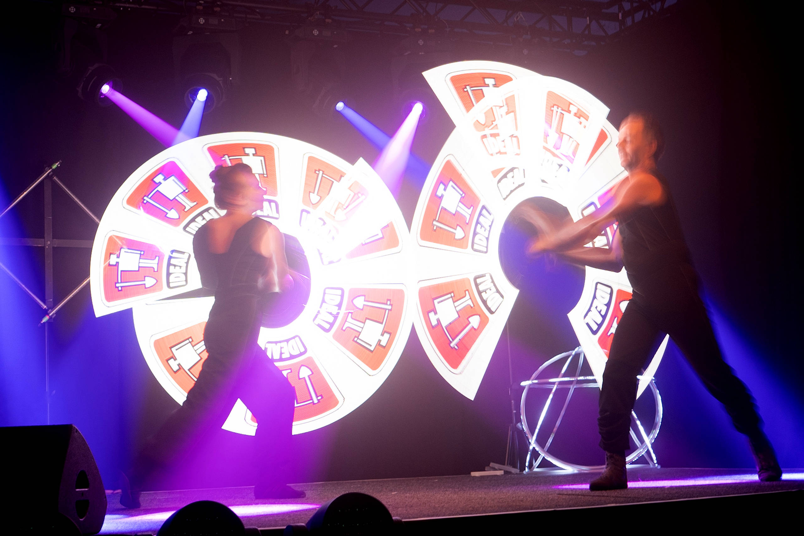 Dabei inszenierten wir eine synchron zur Show-Musik programmierte Lichtshow. Die Artisten ließen durch Lichtjonglage mit speziellen LED-Requisiten faszinierende Lichtbilder auf der Bühne entstehen. Neben phantasievollen Lichtspielen, setzten sie dabei auch das Firmenlogo und Jubiläumsgrüße künstlerisch in Szene. Die Artistik auf der Bühne begleiteten wir mit einer Lasershow. Über den Köpfen des Publikums erzeugten wir auf diese Weise bunte Lichtflächen und Laserstrahlen in der Werkshalle.