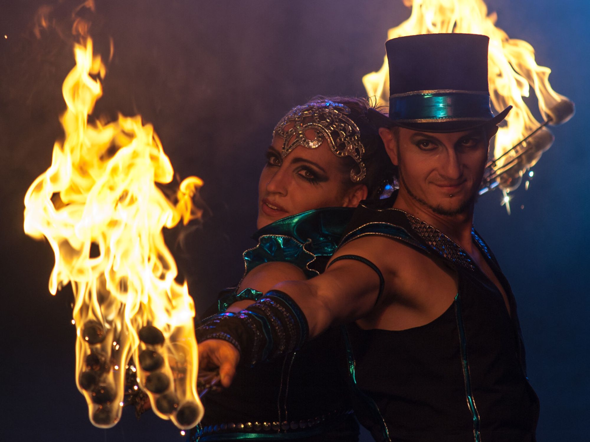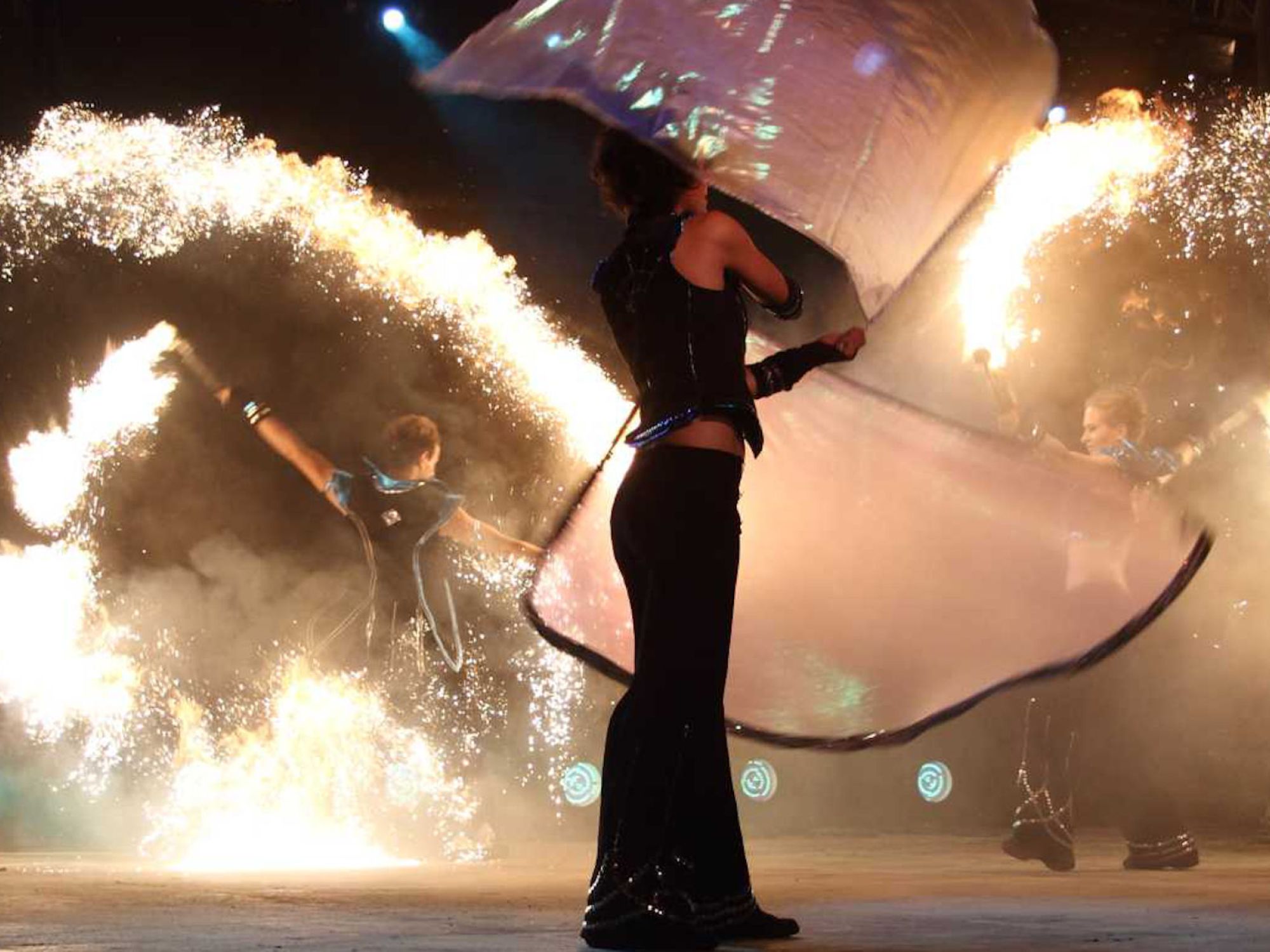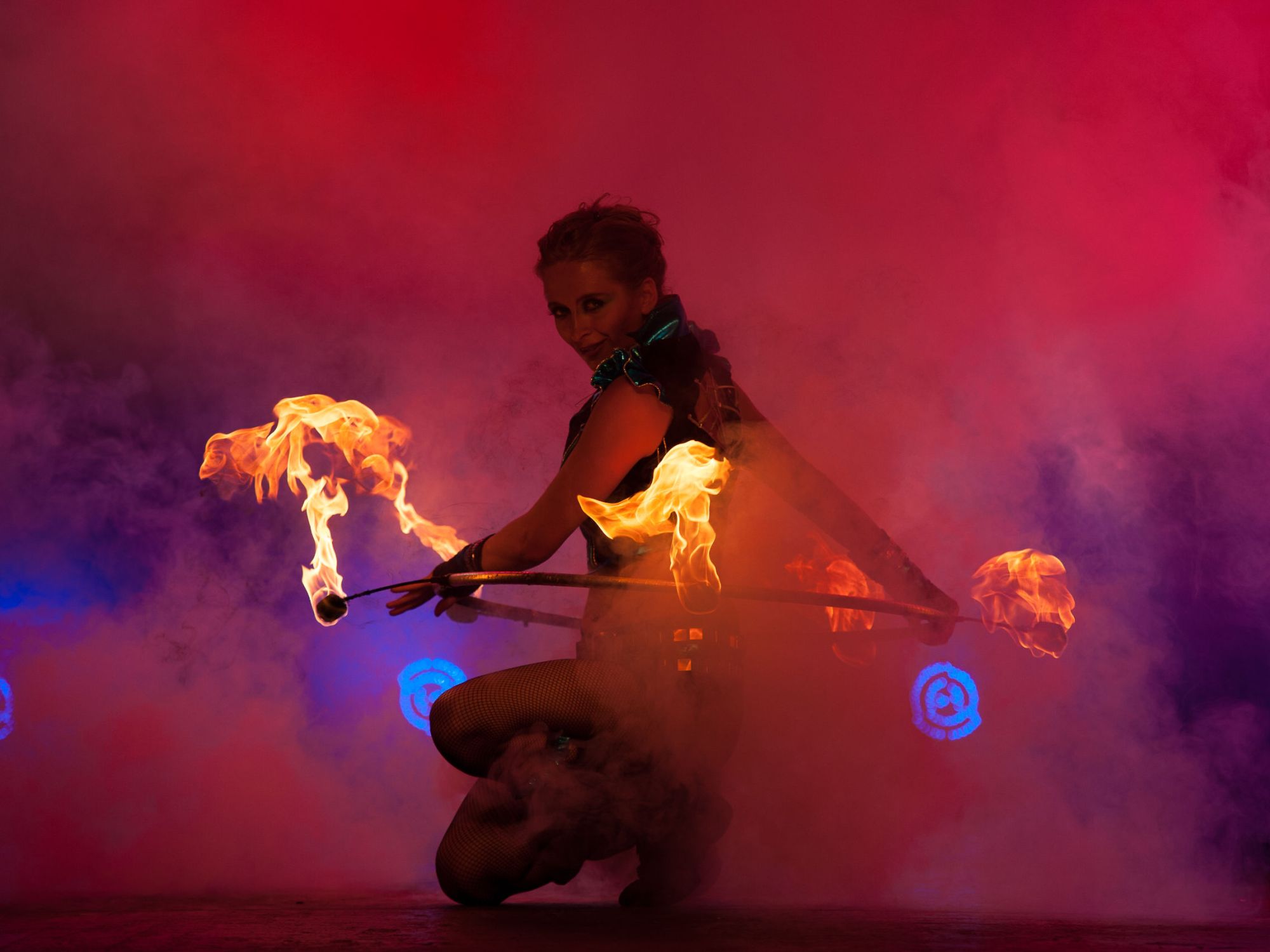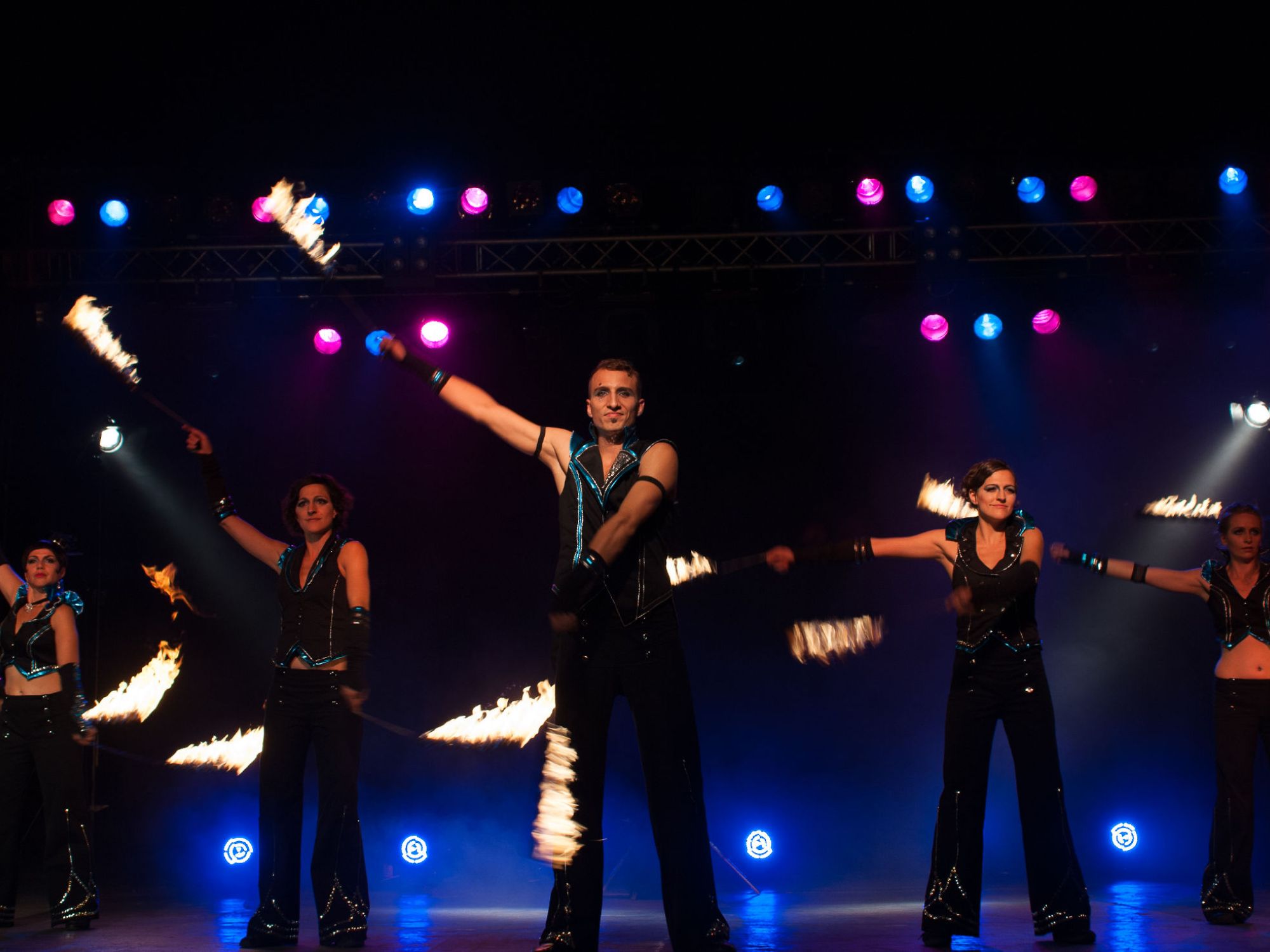 Wir benötigten eine ausreichend große Bühne für zwölf Artist*innen mit brennenden Requisiten. Die vorhandene Lichttechnik für die Ausleuchtung der Auftrittsfläche und Gegenlichteffekte konnten wir mitbenutzen. Außerdem standen genügend Räumlichkeiten für Umkleide, Maske und Catering zur Verfügung. Nachdem wir von der Hamburger Behörde für Brandschutz die Genehmigung für feuergefährliche Handlungen und Bühnen-Pyrotechnik in Innenräumen erhalten hatten, konnte es losgehen.