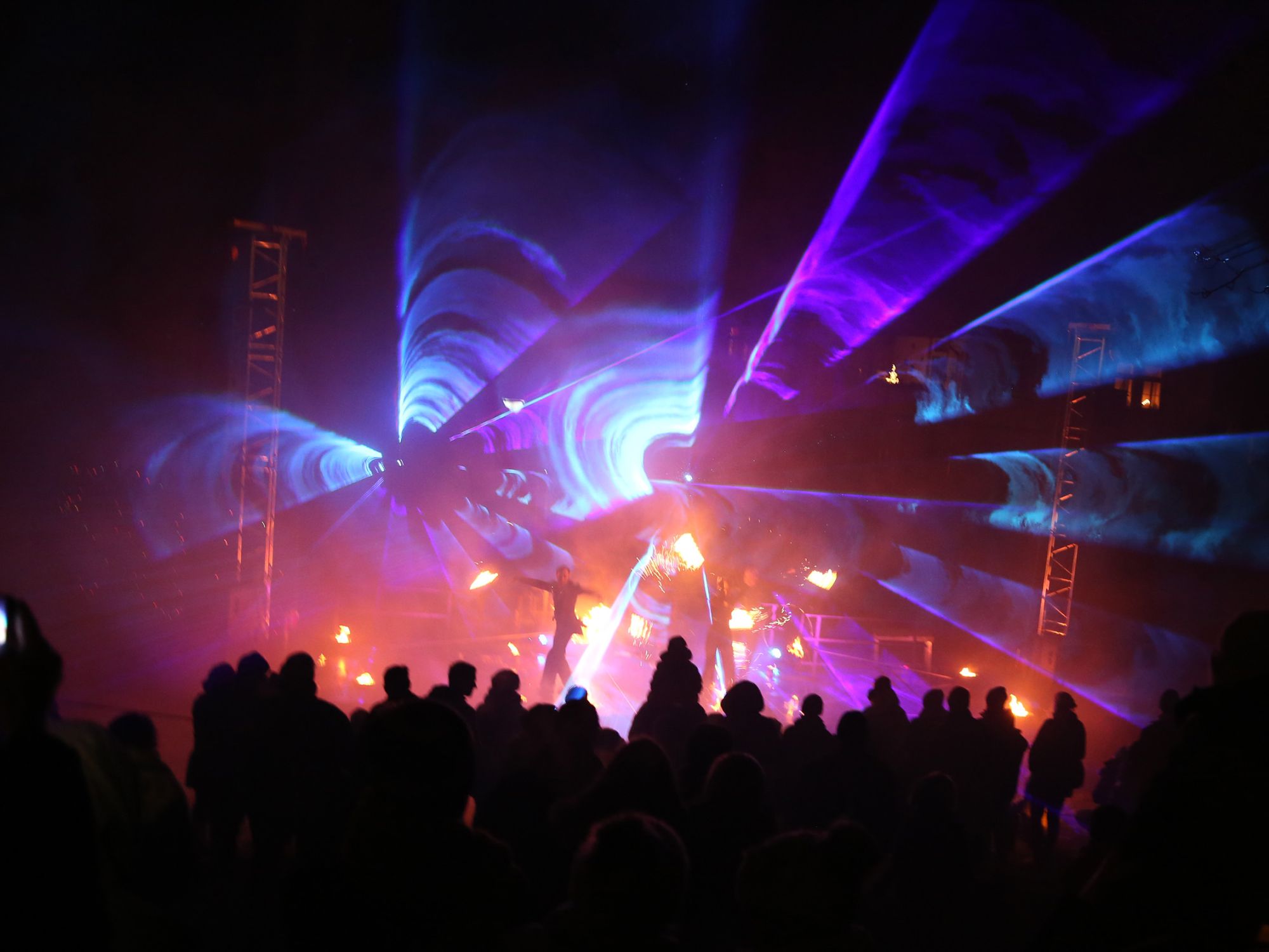 Drei Artist*innen präsentierten eine Feuershow mit unterschiedlichen brennenden Requisiten und setzten dabei auch spezielle Funkeneffekte ein. Wir begleiteten die Feuerartistik mit einer bis ins Detail zur Show-Musik abgestimmten Lasershow. Besonders schöne Eindrücke entstand auch durch die Kombination aus Laserstrahlen im leicht rieselnden Schnee.