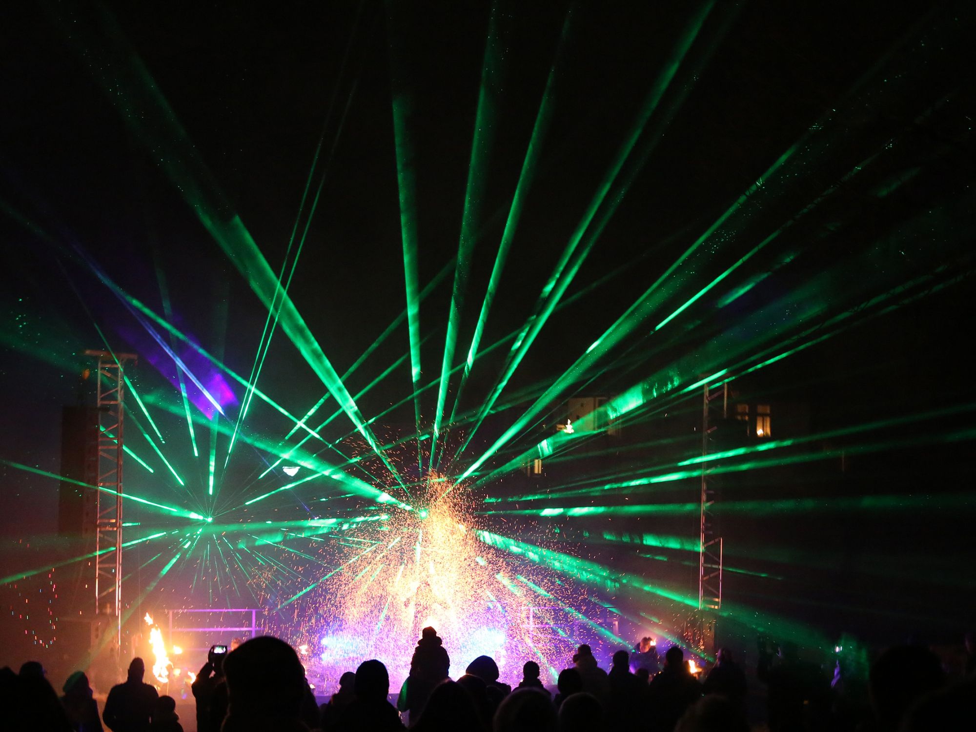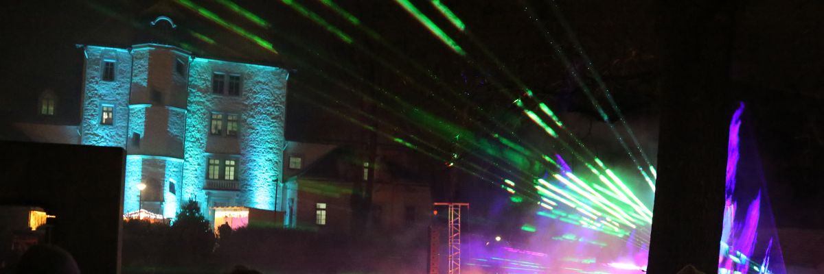 Für die Umsetzung der Lasershow war das Gelände wie geschaffen. Wie in einem Amphitheater hatten alle Gäste einen freien Blick zur Bühne. Die Lasertechnik konnten wir mit einigem Abstand hinter der Bühne aufbauen. Dadurch entfalteten sich die Laserstrahlen und bunten Lichtflächen ganz besonders schön am Nachthimmel.